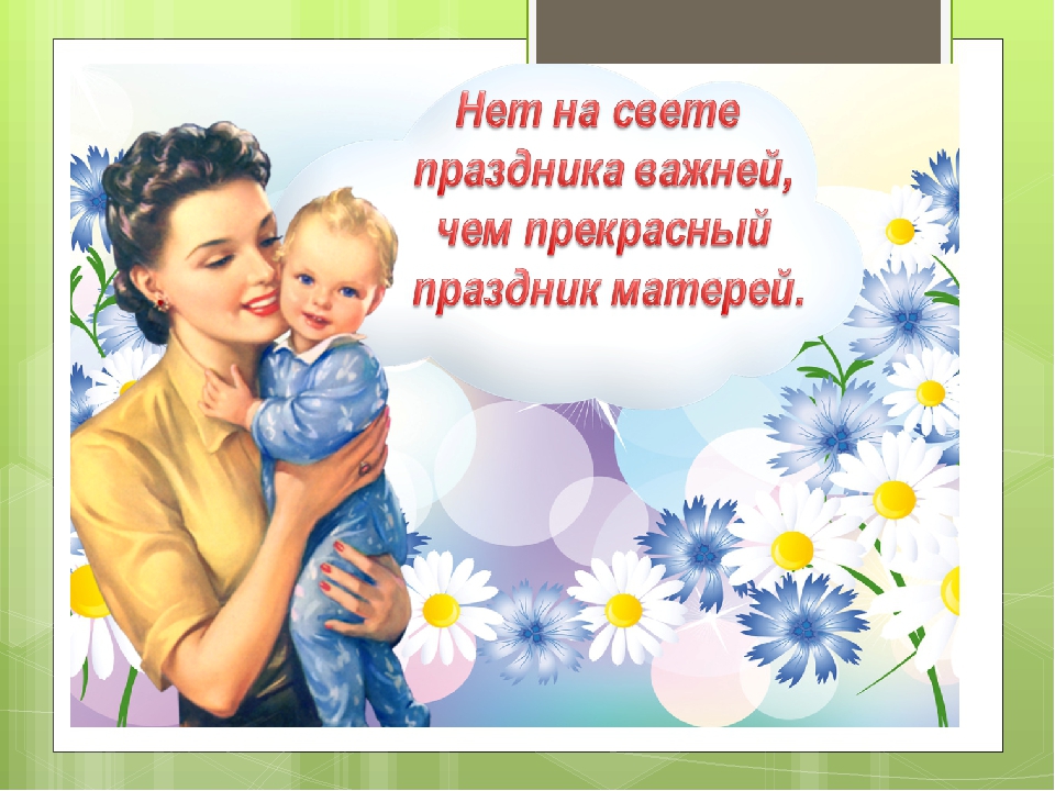 Среди многочисленных праздников, отмечаемых в нашей стране, День матери занимает особое место. Это праздник, к которому никто не может остаться равнодушным. В этот день хочется сказать слова благодарности всем Матерям, которые дарят детям любовь, добро, нежность и ласку.